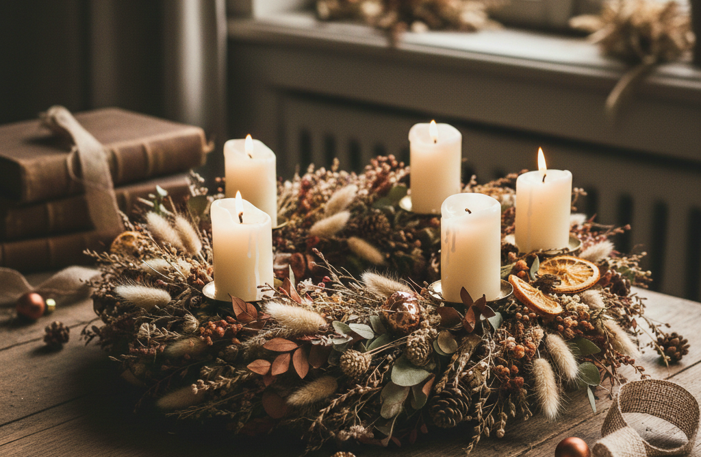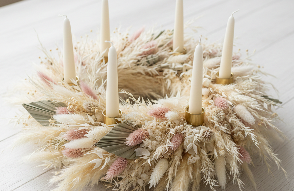 Ein Adventskranz aus Trockenblumen passt perfekt zu einem minimalistischen oder skandinavisch inspirierten Einrichtungsstil und sorgt für eine elegante, ruhige Optik.